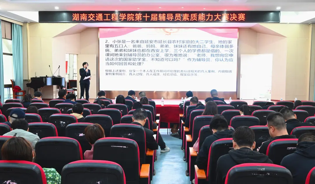 湖南交通工程学院学工处相关负责人介绍,辅导员素质能力大赛,既是学校加强辅导员队伍建设的一项工作,又是一堂激励辅导员不忘初心、勇担使命的实践课,也是推动学校思想政治教育工作发展的重要途径,旨在不断提升辅导员的理论水平、专业素养和业务能力,提升辅导员队伍“品高”“势明”“艺精”“身正”“情深”的品格素质,更好地教育引导和服务学生的成长成才。此赛事现已成为学校辅导员以赛促练、以赛促进、以赛促学、以赛促建的“练兵场”,是展示学校辅导员理论水平、业务能力的“大舞台”,彰显了学校辅导员队伍敬业爱生、博学善教的精神风貌。学校将继续扎实推动辅导员队伍职业化、专业化发展,着力培养一支牢记“为党育人,为国育才”初心使命、践行立德树人根本任务的辅导员队伍,推动学校学生工作内涵式提升、高质量发展。