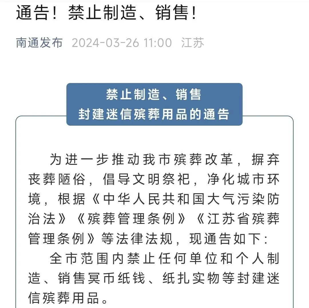 南通发布于3月26日上传了一份由当地民政局和市监局联合署名的通告,称将在全市范围内禁止任何单位和个人制造、销售冥币纸钱、纸扎实物等封建迷信殡葬用品,并表示,这样做的目的是为进一步推动市区冰葬改革,摒弃丧葬陋俗,倡导文明祭祀,净化城市环境。