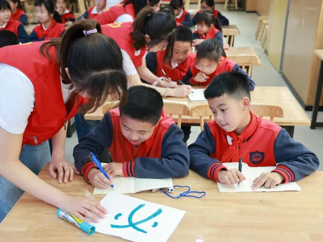 这群“00后”大学生是湖南工业职院女书志愿服务团队成员。活动中,志愿者们向小学生展示了女书文字,讲述女书的历史文化,唱女书歌曲,并现场教小朋友们书写。