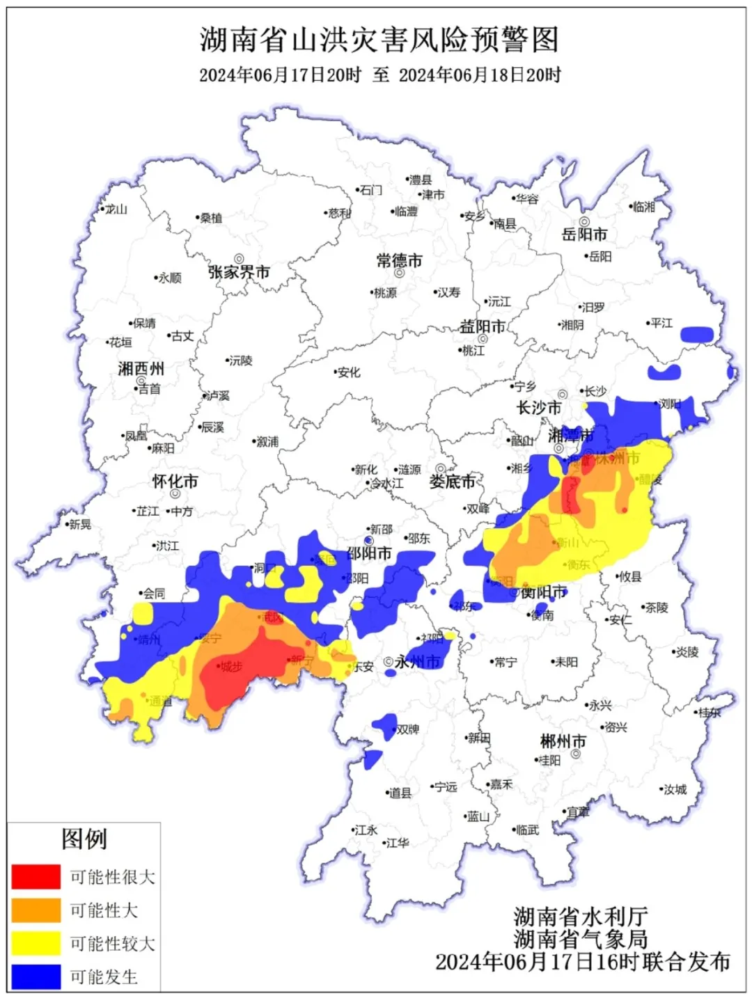 记者6月17日从湖南省水利厅获悉,根据省气象局预报,两部门联合会商得出如下结论:受降雨影响,17日20:00至18日20:00,湘潭市东南部、东北部、南部,衡阳市北部、西部、中部,邵阳市东部、中部、西部、西南部,永州市北部、中部,长沙市南部、东北部,岳阳市东南部,娄底市东南部,怀化市南部,株洲市北部等局地可能发生山洪灾害;衡阳市东北部,邵阳市中部、西南部、南部,永州市北部,长沙市中部、南部,湘潭市东南部,怀化市南部,株洲市中部、东北部等局地发生山洪灾害的可能性较大;衡阳市北部,湘潭市南部、东部,邵阳市东南部、西部、西南部,怀化市南部,株洲市西部、西北部,永州市西部等局地发生山洪灾害的可能性大;湘潭市东南部,邵阳市南部,株洲市中部、西北部等局地发生山洪灾害的可能性很大。