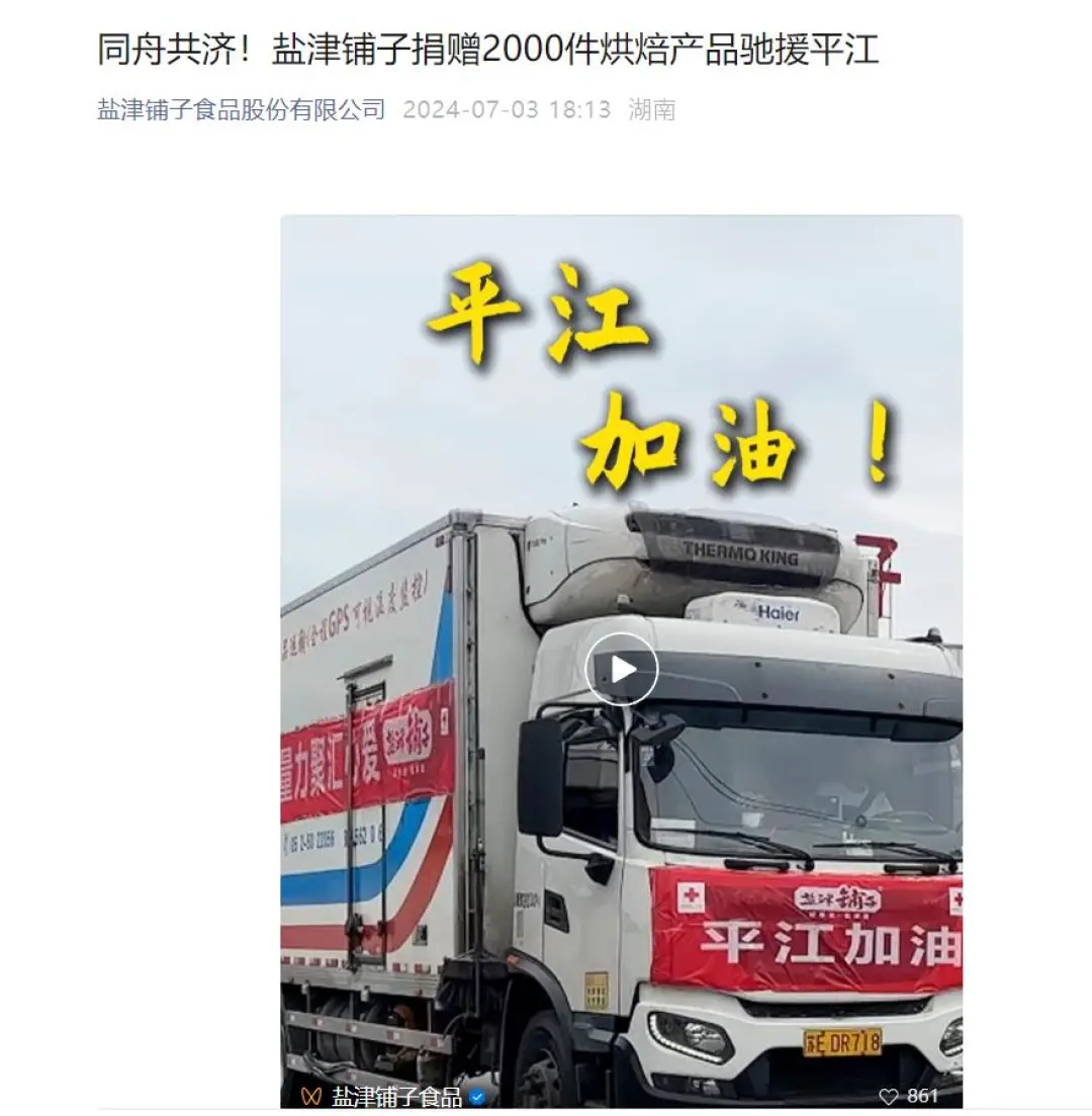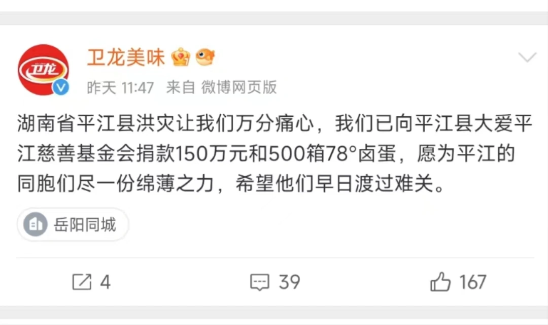 7月3日,卫龙美味官方微博称,已向平江县大爱平江慈善基金会捐款150万元和500箱78°卤蛋,愿为平江的同胞们尽一份绵薄之力,希望他们早日渡过难关。