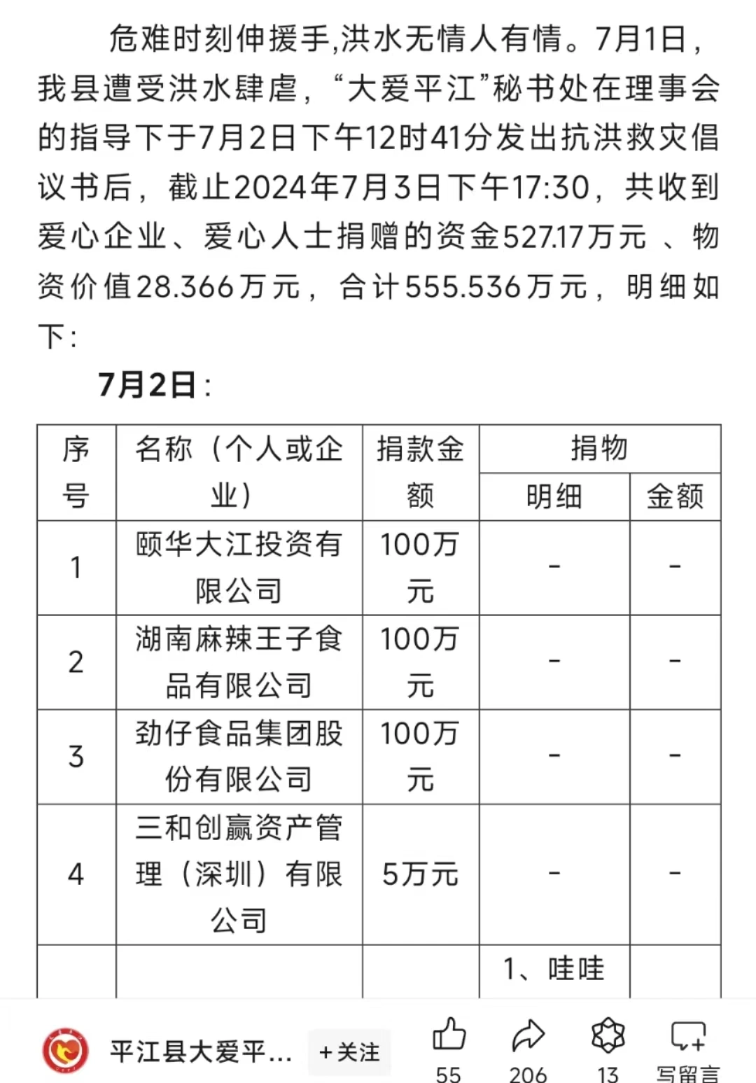 7月1日,“大爱平江”秘书处在理事会的指导下于7月2日下午12时41分发出抗洪救灾倡议书,当天下午,基金会公布爱心捐赠榜,其中,湖南麻辣王子食品有限公司捐款金额为100万元。