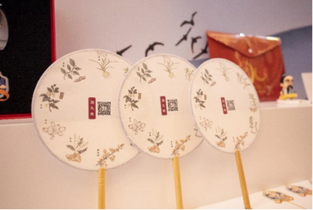 憨态可掬的“仲景嗲嗲”卡通形象,不仅被做成了实用美观的手机支架、钥匙扣,还在雨伞、鼠标垫、书签等产品上活灵活现;一次性纸杯上,精美地印刷了“医圣”张仲景在长沙坐堂行医的典故;美观古典的团扇,绘制了“湘九味”9种药草图案;可随身携带的帆布包,则印上了马王堆汉墓医书的元素……还有明信片、贴纸、中性笔、笔记本等产品,湖湘中医药文化元素无处不在。
