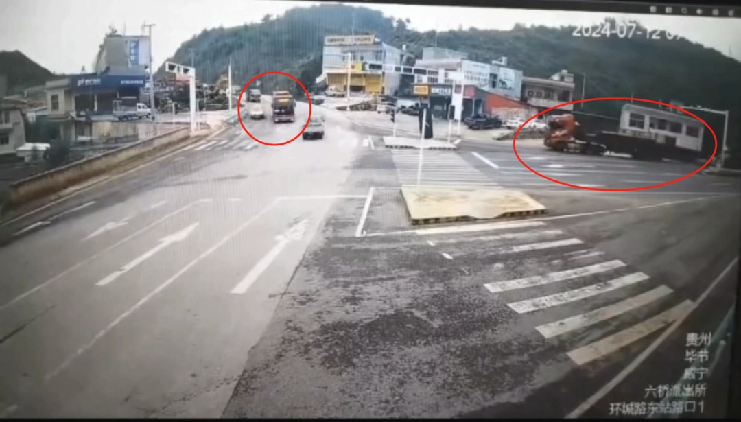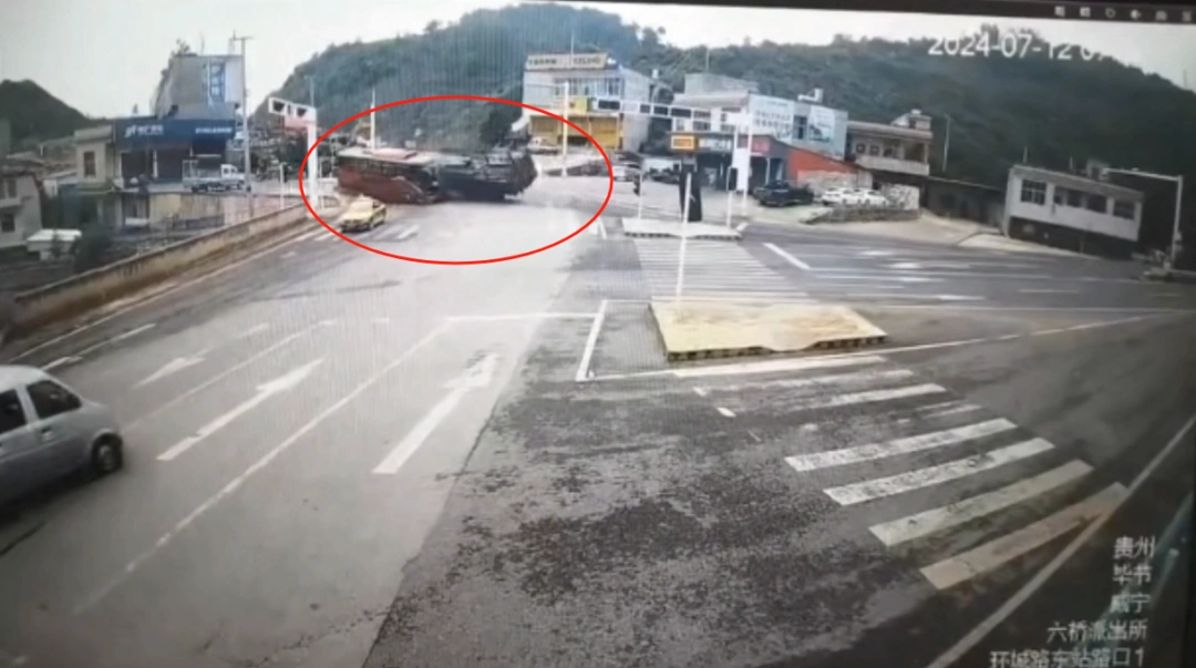 一段网传监控视频显示,7月12日早晨,在贵州毕节威宁县六桥街道环城路东站路口附近,一辆正在下坡的巴士被左方驶来的一辆货车撞上。相撞前货车速度较快,货车随后失控翻倒,巴士被撞后掉下附近一护坡,从视频画面目测,护坡落差高度与旁边楼房第二层大致相当。