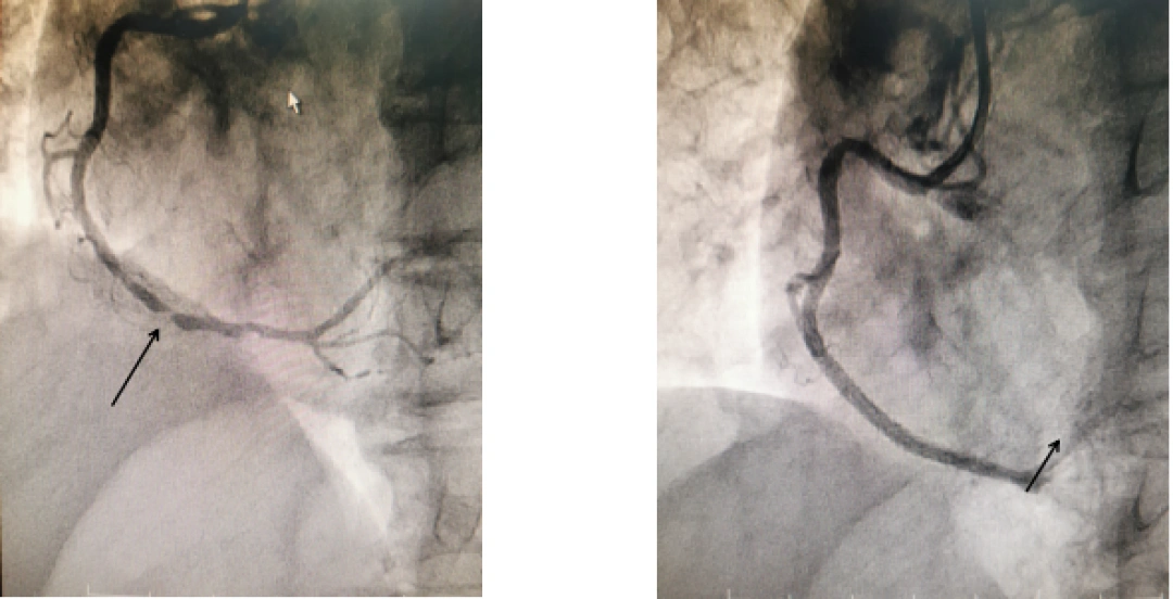 心血管内科一区副主任艾旗与李爷爷及其家属充分告知病情,同时给予患者双联抗血小板药物的预处理及对症治疗,并进行急诊介入谈话,患者及家属同意急诊介入治疗。造影结果显示患者左侧前降支近段弥漫性狭窄约50%,回旋支中段慢性闭塞,右冠近中远段狭窄95%,冠脉三支病变,有行血运重建指针。艾旗副主任、陈成医师成功为患者于右冠中远段植入支架2枚,从会诊到支架植入,仅用了3小时。术后,患者腹痛症状明显缓解。