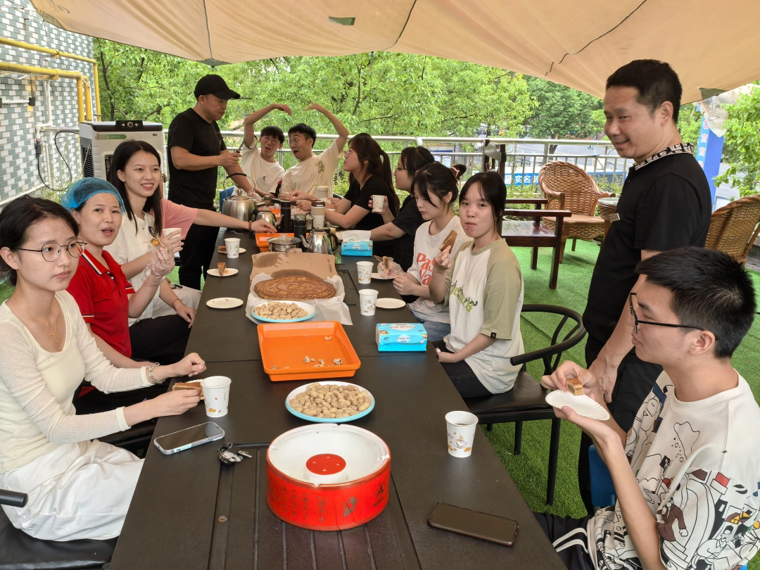 青年学生们围坐在五食堂的餐桌旁,一边品尝月饼,一边吃着零食,一边闲聊开学后的生活,场面温馨而热烈。还有学生拿出手机连线远方的父母,把自己在学校的幸福生活与家长分享,收获了家长的点赞与笑脸。