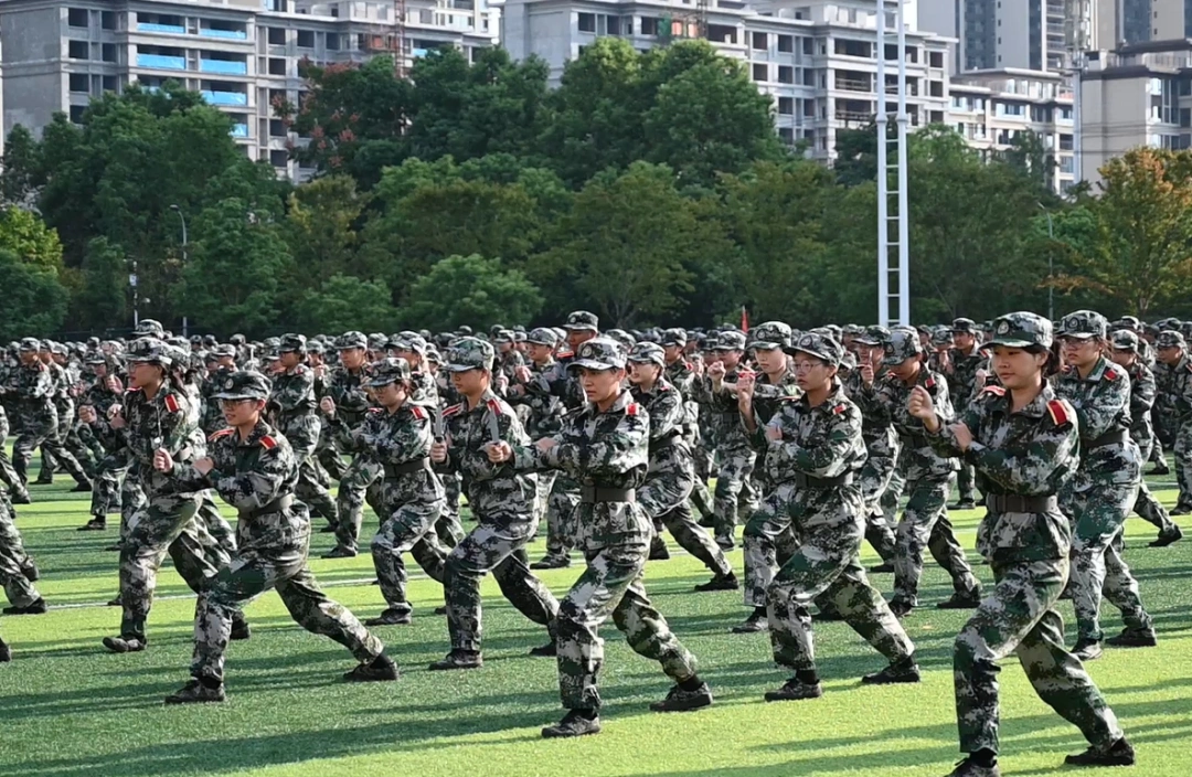 军训汇演中,首先登场的是军体拳方阵,同学们英姿飒爽,行动间苍劲有力、干净利落,口号嘹亮。其次进行汇报演出的是擒首操队伍,他们个个手握匕首,眼神犀利,一招一式间尽显威猛霸气。