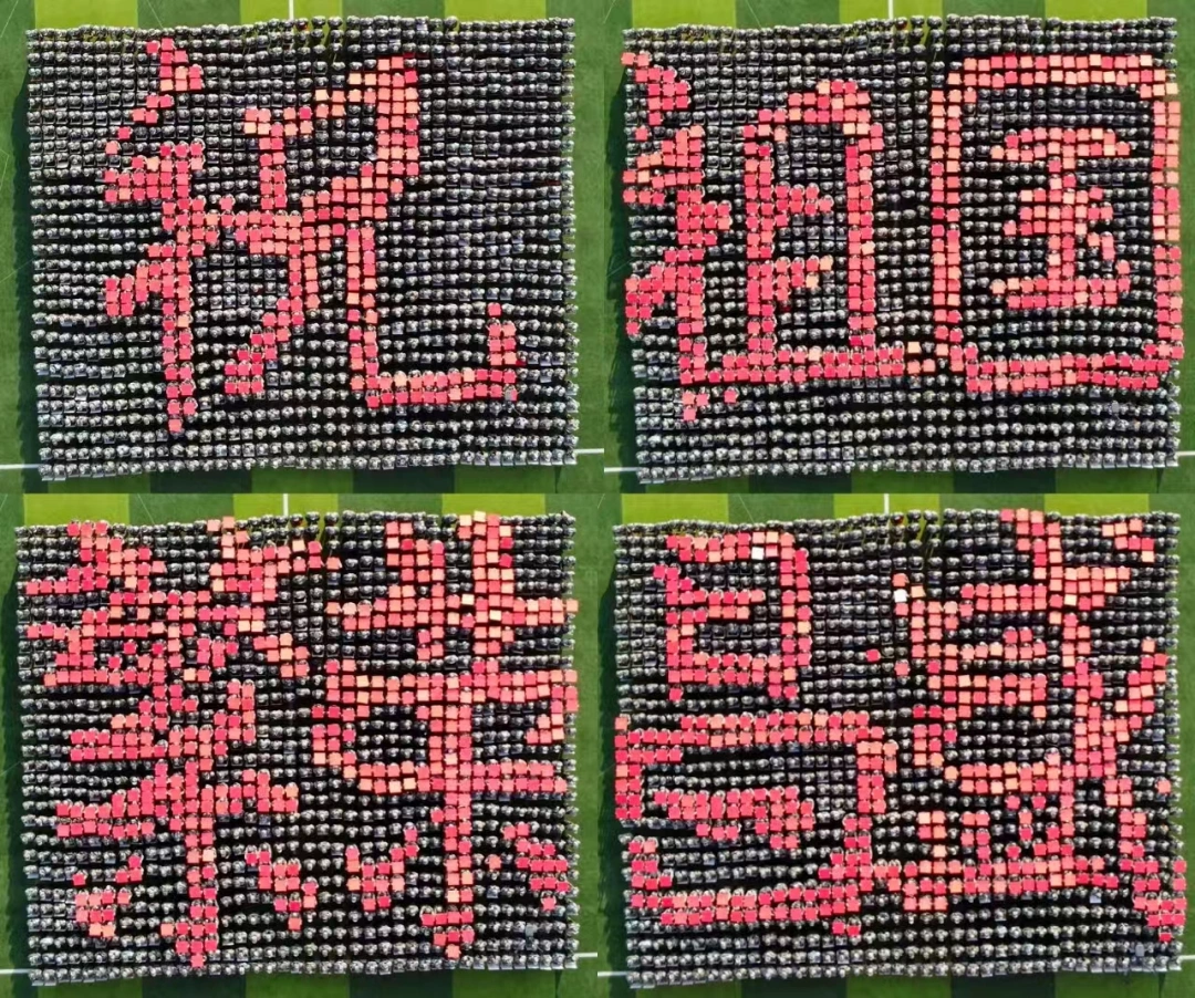 来自各个二级学院的同学们组成的字形方阵成为全场的焦点。他们用手中的红色卡牌拼凑出航母与四架飞机的形状缓缓入场,展现出非凡的默契。在新中国成立75周年之际,新生们用变换的数字和图案,诉说新中国成立前后的奋斗故事,表达对祖国最真挚的祝福,引得现场热情高涨,掌声经久不息……