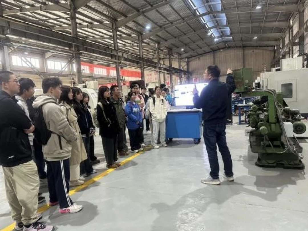 走进实训中心,几十台数控加工设备整齐排列,学生们正穿梭其间,聚精会神地操作。欧阳陵江带领同学们参观了各种机床设备,介绍了实训工厂的发展历史、校企合作情况、人才培养模式及相关课程内容。