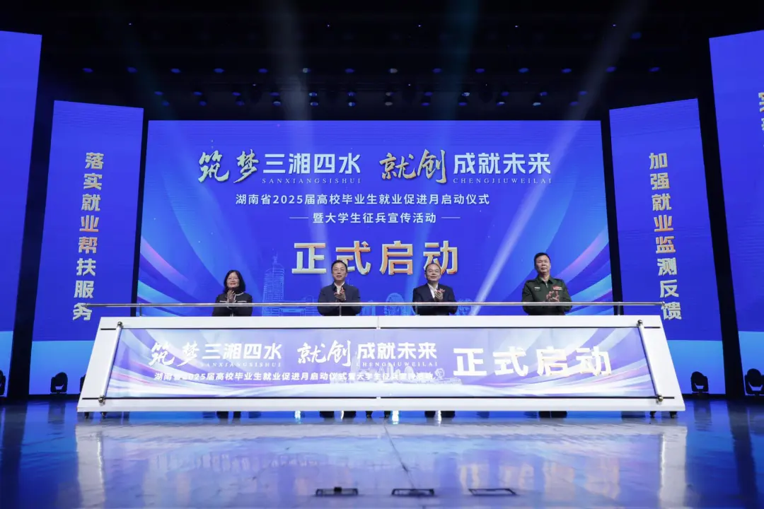 10月29日上午,湖南省2025届高校毕业生就业促进月启动仪式暨大学生征兵宣传活动在长沙学院举行。本次就业促进月主要内容为“1+6”系列活动,“1”是主会场系列活动,包括就业促进月启动仪式、就业常设市场招聘会(长沙学院专场)、大学生征兵系列宣传活动。“6”是会同省直有关部门和全省高校开展系列招聘、就业市场开拓、创业带动就业、就业工作培训、大学生征兵宣传、重点群体帮扶6大主题活动。
