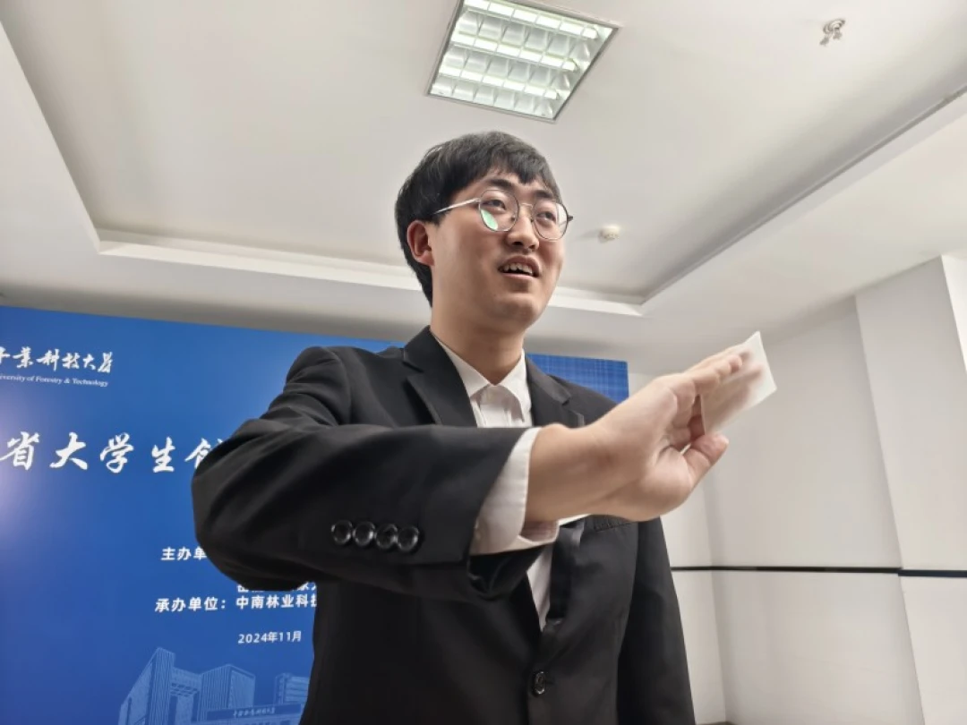 其中,中南林业科技大学材料科学与工程学院2024级研究生刘竹用激情洋溢的演讲,为在场的观众带来了“竹层递进:多功能竹塑复合材料”项目演讲。该项目解决了当前竹塑材料存在易霉变、强度低、易燃烧、制造能耗高等技术难题,并结合市场需求与合作企业研发出多功能竹塑复合材料产品。