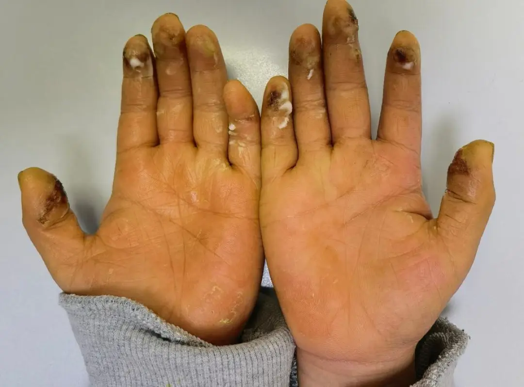 据了解,8岁的小凯是一名小学三年级生。自从“拍烟卡”在小学生群体中流行起来,小凯也成了烟卡游戏的爱好者,几乎每天放学后会和小伙伴们相约在小区里玩拍烟卡的游戏。这种游戏的玩法是通过用手击拍地面,使对方烟卡翻面,从而赢取卡片。然而,长时间的手部拍打地面导致小凯的双手皮肤与地面频繁摩擦,出现了红斑和脱皮现象,对于父母的劝阻,小凯并没有放在心上,依旧在放学后和伙伴偷偷玩烟卡。随着情况逐渐恶化,小凯的双手指出现了脓疱、糜烂和结痂,并伴有剧烈的疼痛和瘙痒感,这才被父母强制带到医院治疗。
