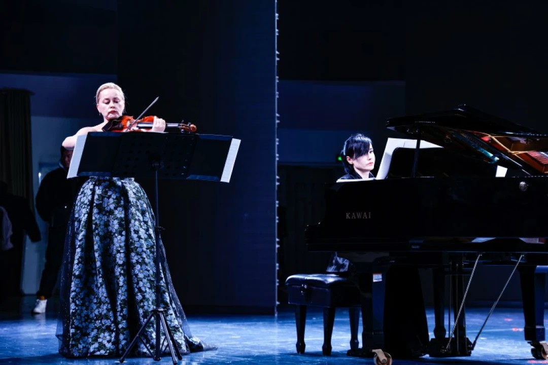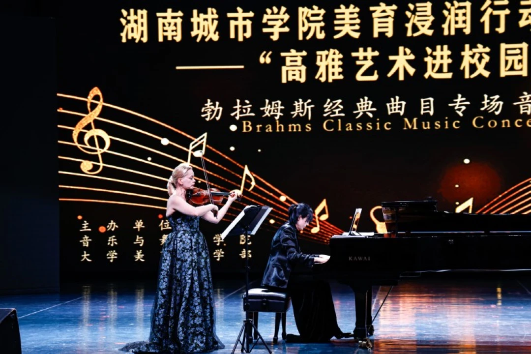 12月16日晚,“勃拉姆斯经典曲目专场音乐会”在湖南城市学院音乐厅上演。本场音乐会由乌克兰籍钢琴家、湖南城市学院教师孙·娜塔丽雅,携手俄罗斯籍小提琴家、湖南理工学院教师安娜·加宁联袂出演,呈现了勃拉姆斯流传下来的仅有的三首小提琴奏鸣曲。