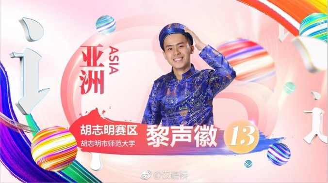 黎声徽是一名越南小伙子,2018年,在“汉语桥”世界大学生中文比赛的舞台上,黎声徽开启了他的首次“汉语桥”之旅,这也是他第一次来到中国。“虽然最后只得到优秀奖,但这个比赛真的让我有了很大的成长。以前的我不是一个善于在公众面前演讲和表达自己的人,‘汉语桥’给了我一个挑战自我的机会。”现在他已经是胡志明财经大学的一名中文教师,并且还在当地的一家语言机构承担了中文辅导工作。