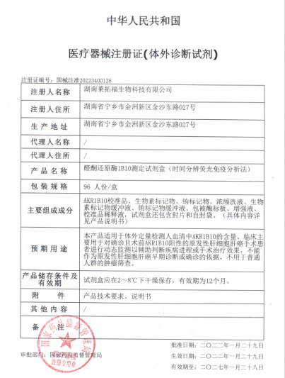 近日,南华大学曹德良教授团队经过10余年深耕,成功研制新型原发性肝癌诊断试剂盒《醛酮还原酶1B10测定试剂盒(时间分辨荧光免疫分析法)》,并获得了国家药品监督管理局三类诊断试剂注册批文。这是我国第一个具有完全自主知识产权的肝癌诊断试剂盒,也是全球首个基于醛酮还原酶1B10(AKR1B10)的肝癌诊断产品。