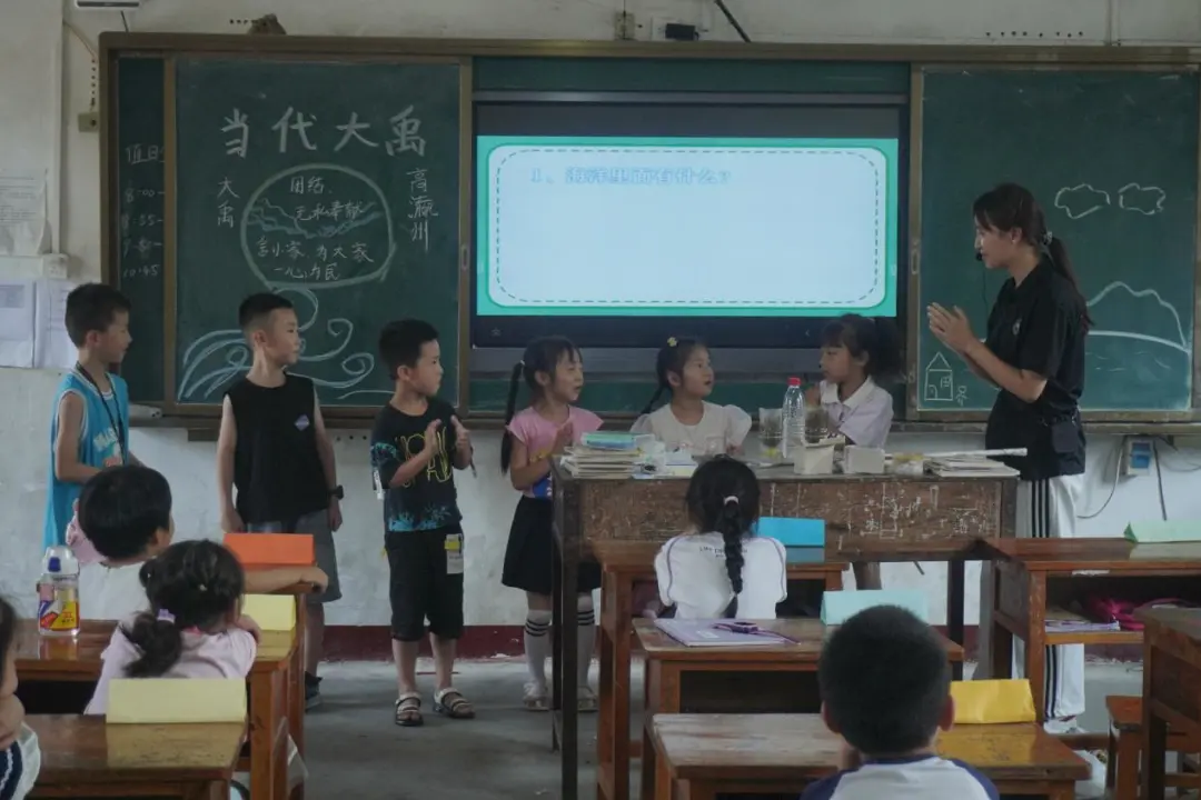 解决了“怎么读”的问题,团队又将目光投向“读什么”与“如何读得更广”。依托外语专业优势,实践团创新开设“英文故事课堂”,将《大禹治水》《愚公移山》等中国传统神话改编成双语版本。志愿者用生动的肢体语言演绎“愚公移山”的坚持,用趣味问答解析“大禹治水”的智慧,让孩子们在英语语境中感受中华文化的魅力。课后,孩子们围着志愿者追问,那些充满童真的问题,让志愿者们深刻感受到知识启蒙的力量。