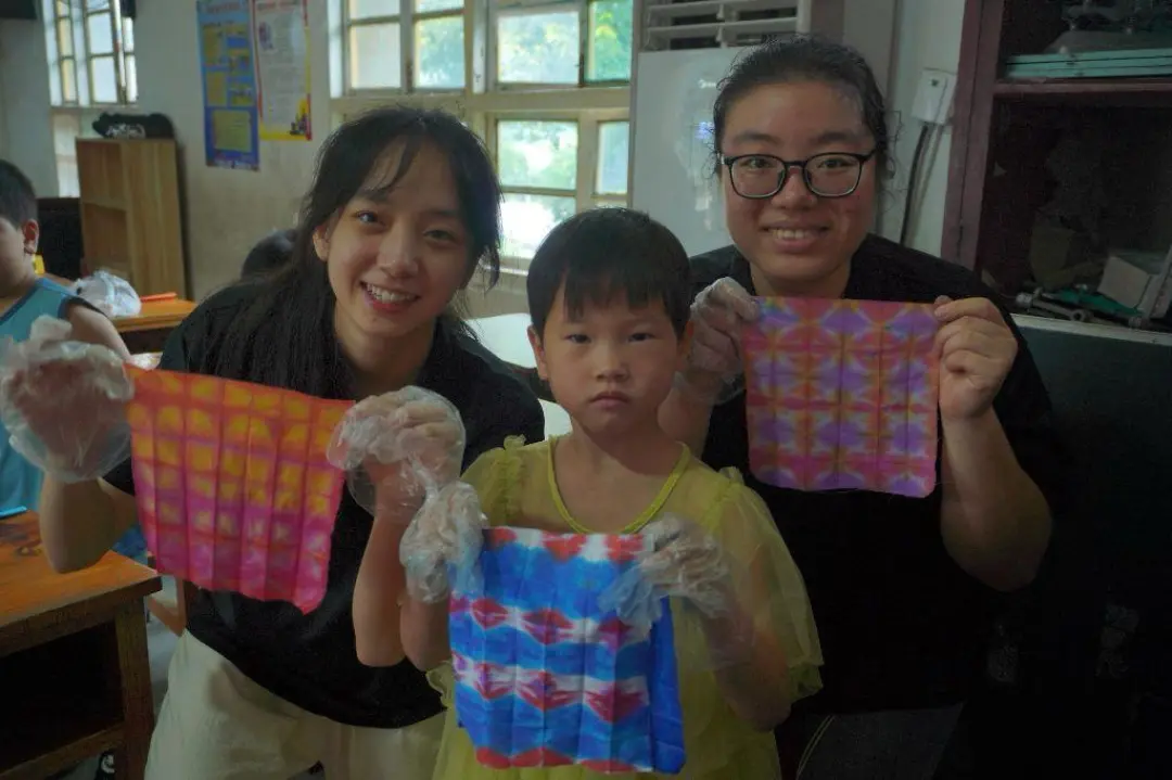 视野的拓展为阅读注入了新活力,团队进一步探索“阅读+实践”的深度融合。实践团创新设计“阅读+实践”特色活动:开设非遗手工体验课,结合《中国传统节日故事》阅读,指导儿童制作扎染等非遗手工艺品,他们对照书中描述,将靛蓝染出层层叠叠的云纹。当抽象的文字转化为指尖的温度,当书中的场景在眼前鲜活重现,孩子们对故事的理解愈发深刻,阅读的兴趣也愈发浓厚。