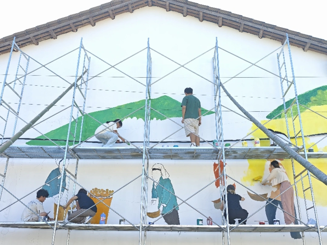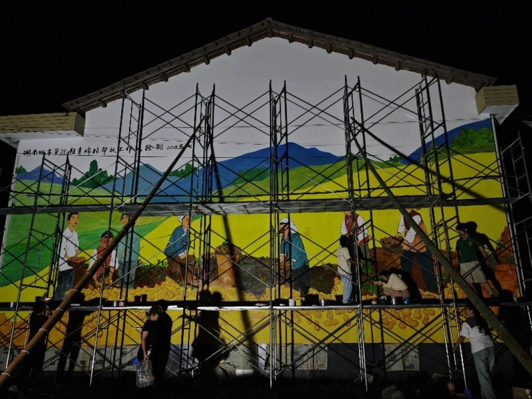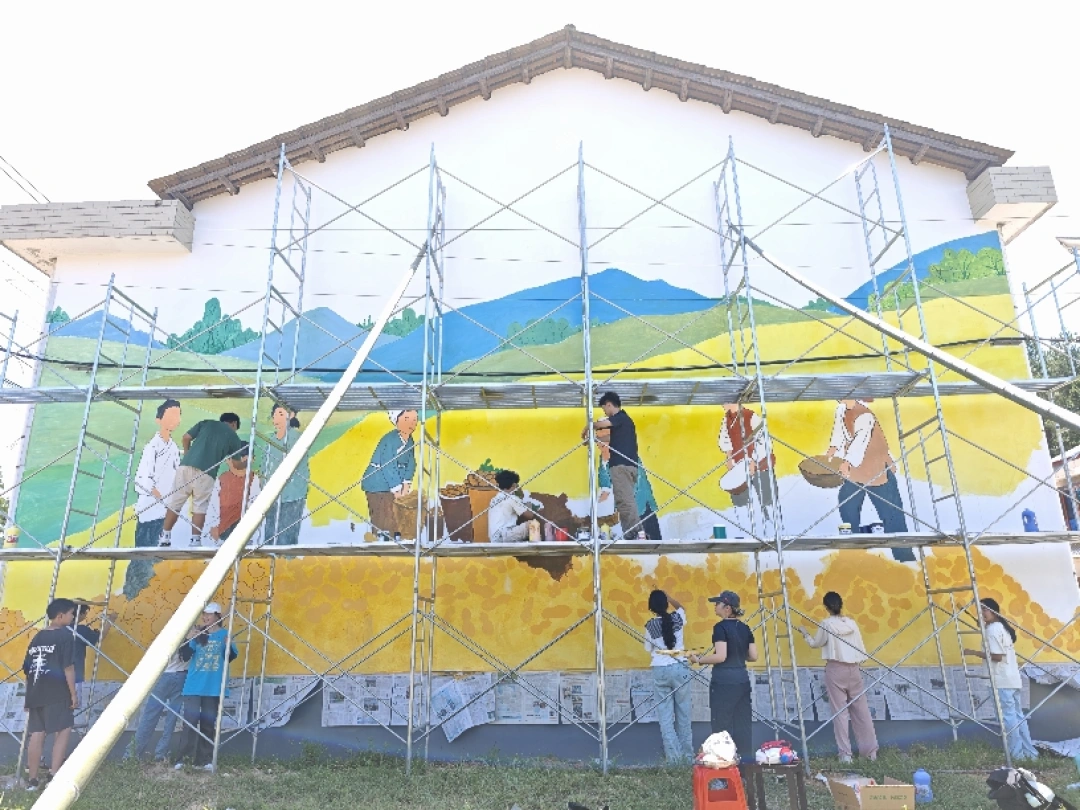 近日,湖南城市学院美术与设计学院/国际教育学院师生深入乡村一线,以画笔为犁,在安化县青峰村村头巷尾精心绘制主题墙绘。一幅幅描绘当地特色农产“小籽花生”从播种、生长到丰收的生动画卷,如无声的诗篇在阳光下流淌,为古老村落注入清新活力。