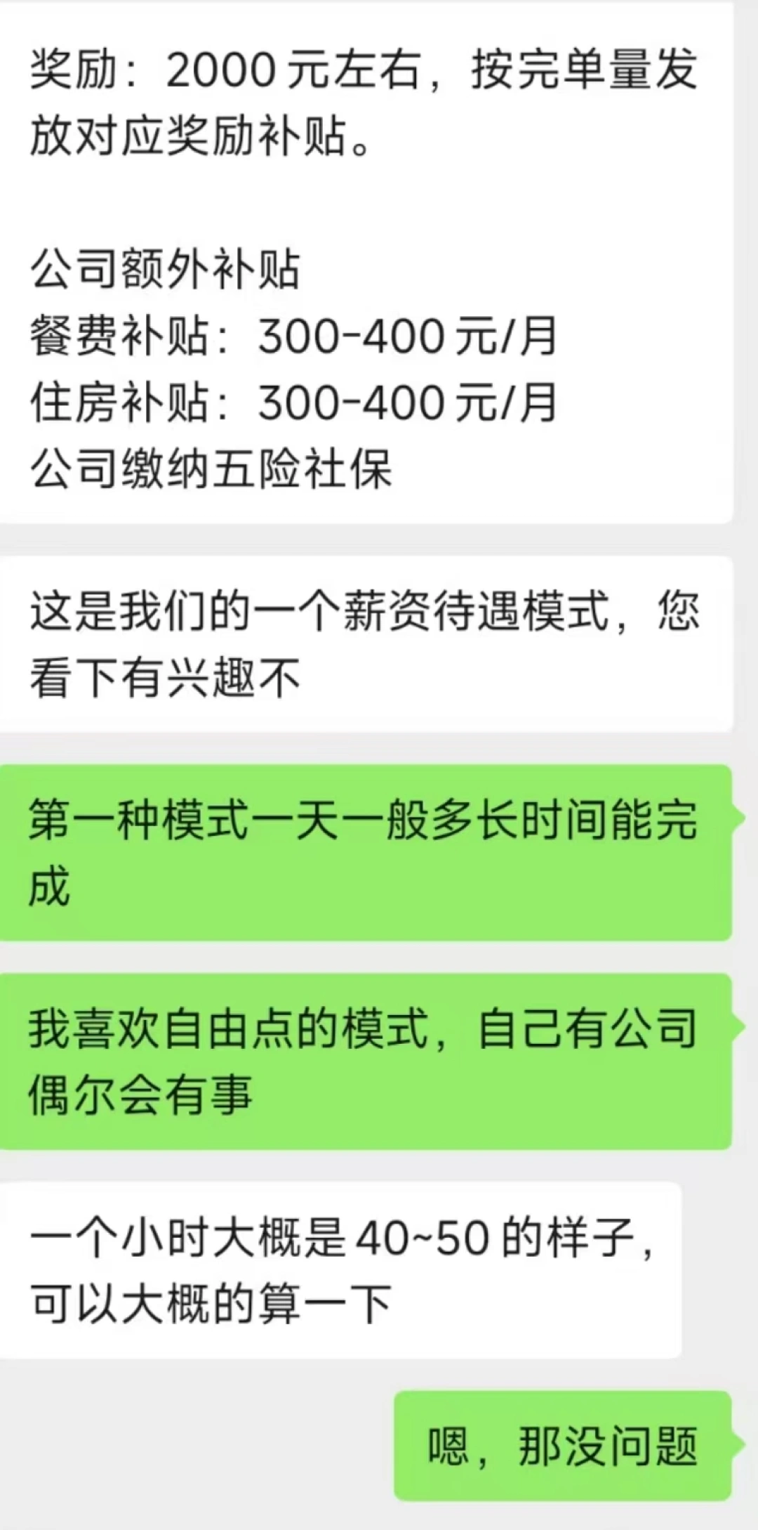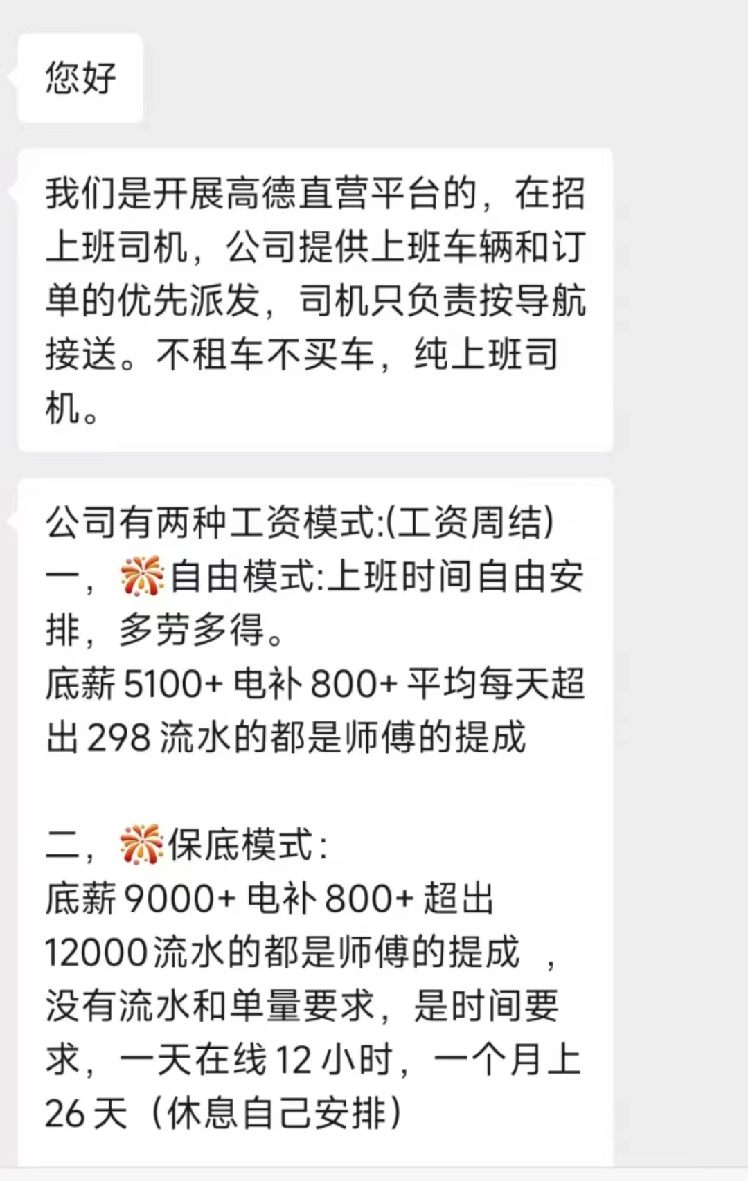 聊天截图显示,客服表示,公司提供车辆并派发订单,司机只负责按照导航接送。可选择“自由上班模式”:一小时营业额40—50元,工作约8小时就能完成298元的营业指标,完成后司机可获得最少170元的分成,“上班时间自由安排,多劳多得。”