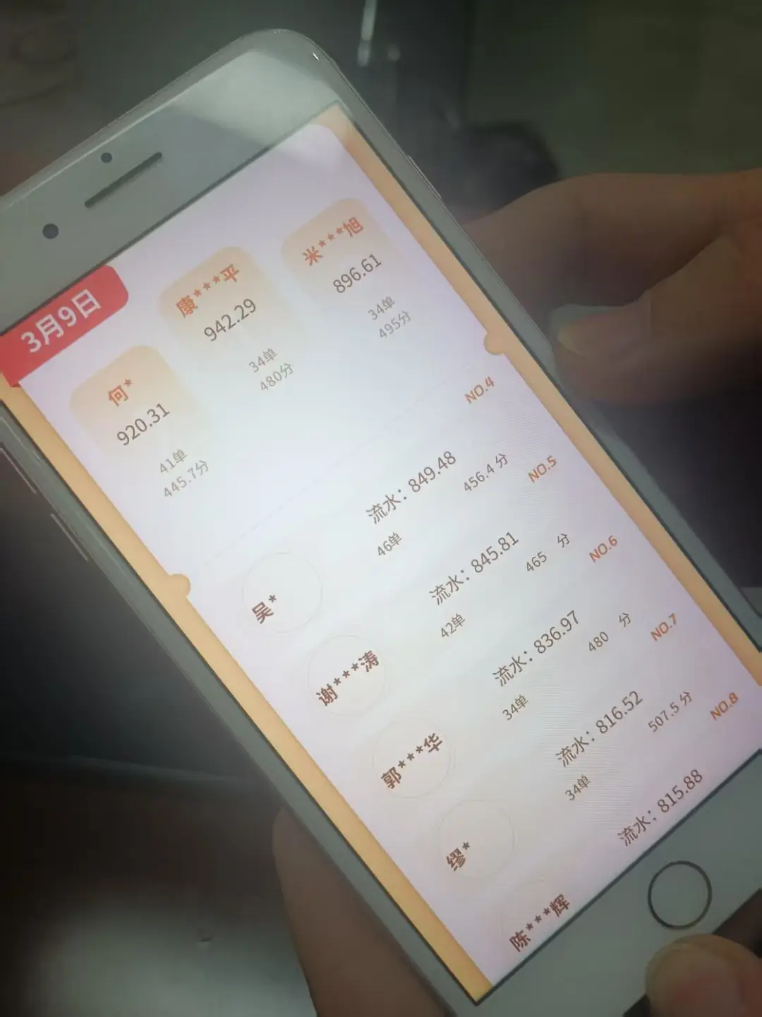 该工作人员表示,张先生如果能持续做下去,提高等级,就能接到更优质的单,营业额就高了。其展示了3月9日当天平台司机营业额排名,前3名均有约900元。