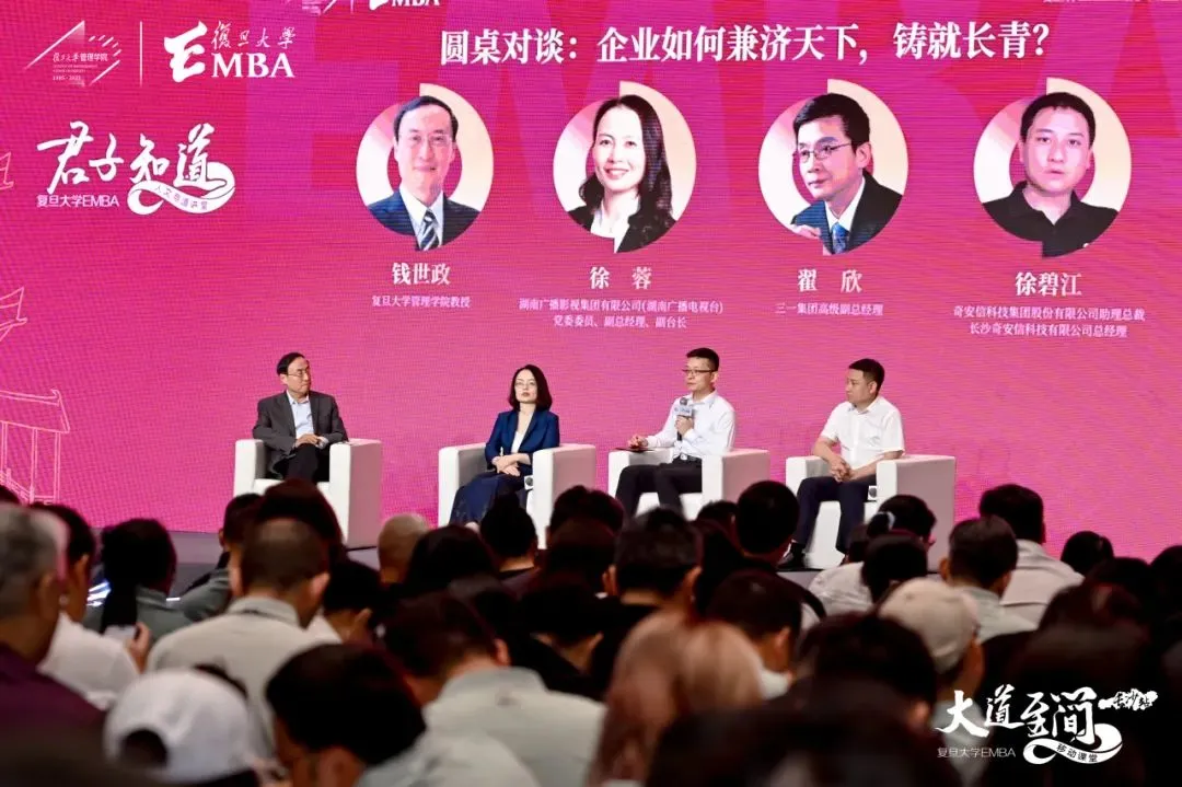由复旦大学管理学院教授钱世政主持以“企业如何兼济天下、基业长青?”的圆桌对话。邀请了自湖南广播影视集团有限公司党委委员、副总经理、副台长徐蓉,三一集团高级副总经理翟欣、奇安信科技集团股份有限公司助理副总裁徐碧江展开深入探讨,分享了在经济周期、社会责任、全球竞争中的应对与选择。