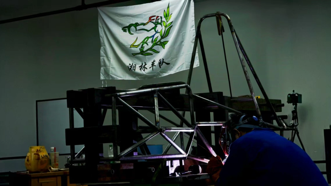 8月27日,长沙市中南林业科技大学,几位大学生正在对一辆赛车进行调整,工作间摆满了压力机、切割机、夹具等设备,一辆金属框架赛车被置于其中。