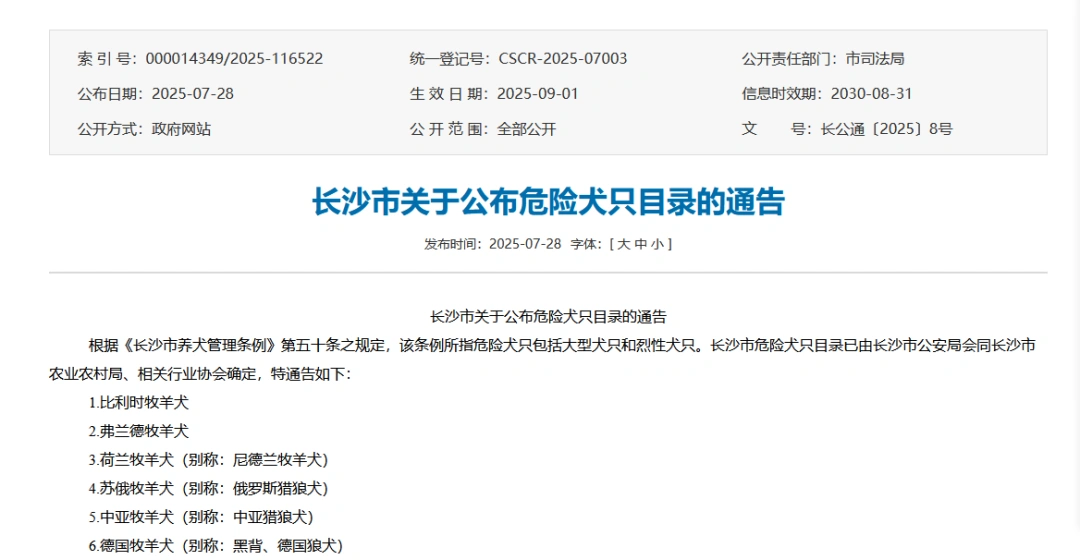 8月4日,潇湘晨报记者从长沙市政府官方网站了解到,长沙市公安局、市农业农村局于7月28日联合印发的《长沙市关于公布危险犬只目录的通告》中,中华田园犬(土狗)被移出《危险犬只目录》,该《通告》自2025年9月1日起施行,有效期五年。