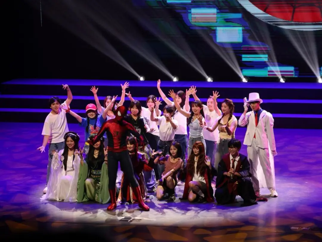 舞台表演环节同样精彩纷呈。活动方巧妙融合公众号预告中的 coser 互动,配合《抢!抢个入场券!》主题短片对电影史的回溯,《哪吒》《哈利・波特》等经典角色 “穿越” 而来,实现了 “银幕经典” 与 “青春创作” 的跨时空对话;工种情景剧《重生之我在片场》以幽默诙谐的方式,展现了影视制作背后的酸甜苦辣;在晚会的最后,每一部短片的主创团队轮流上场谢幕,同学们大合唱自己作词作曲而成的歌曲《我在I’m Here》,将现场气氛推向高潮。