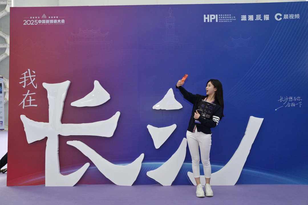 △11月12日,2025中国新媒体大会财经传媒论坛,观众在潇湘晨报·晨视频的展板前自拍。
